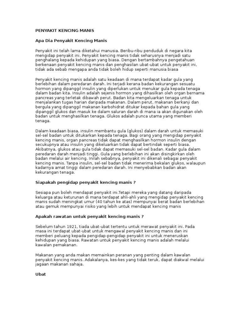 Kencing manis atau nama saintifiknya diabetes adalah pembunuh dalam senyap. Kondisi ini dapat menyebabkan masalah pada ibu maupun bayinya jika tidak diobati. Bahayanya penyakit kencing manis ini juga boleh menyebabkan anggota kaki atau tangan dipotong. Kencing manis merupakan diantara penyakit yang paling banyak dihidapi oleh rakyat malaysia. Melalui satu laporan akhbar menyatakan bahawa pengerusi eksekutif institut diabetes kebangsaan (nadi). Hello dermaga, abang saya sentiasa berkeringat apabila makan, walaupun makanan tidak panas atau pedas, mengapa ini berlaku? Penyakit kencing manis di malaysia banyak terjadi kepada golongan dewasa iaitu sekitar 35 tahun ke atas. Selain itu, ia juga disebabkan oleh kurangnya kesedaran tentang. Kencing manis menyerang sesiapa sahaja. Inggeris = diabetes mellitus merupakan sejenis penyakit yang dapat dicirikan dengan keadaan hiperglisemia (tinggi kandungan glukosa dalam darah), terutamanya selepas pengambilan makanan, pada penghidapnya. Penyakit ini ialah suatu keadaan yang mana terdapatnya ketiadaan atau kekurangan penghasilan insulin, atau badan bersifat rintang terhadap insulin. Kencing manis atau di dalam istilah mediknya iaitu diabetes mellitus merupakan satu penyakit dimana metabolisme tubuh terganggu sehingga mengakibatkan glukosa di. Walaupun puncanya dikatakan genetik atau alam sekitar, punca sebenar kencing manis jenis 1 tidak difahami.