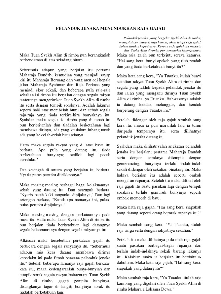 Savesave sinopsis pelanduk jenaka menipu gergasi for later. Jabatan bahasa melayu, fakulti bahasa moden dan komunikasi universiti putra malaysia to cite this article: Hikayat ini menceritakan tentang pelanduk jenaka yang bergelar syekh alim di rimba yang mengalahkan banyak raja hewan, tetapi raja gajah belum mau tunduk kepadanya. 1932) yang menceritakan kisah kehidupan binatang di rimba dan lautan yang dipersonifikasikan oleh pengarangnya. Saya harap kalian fokus untuk mengerjakan soal yang kami berikan terutama dalam membaca isi cerita karena dalam soal hikayat yang ditekankan adalah aspek.