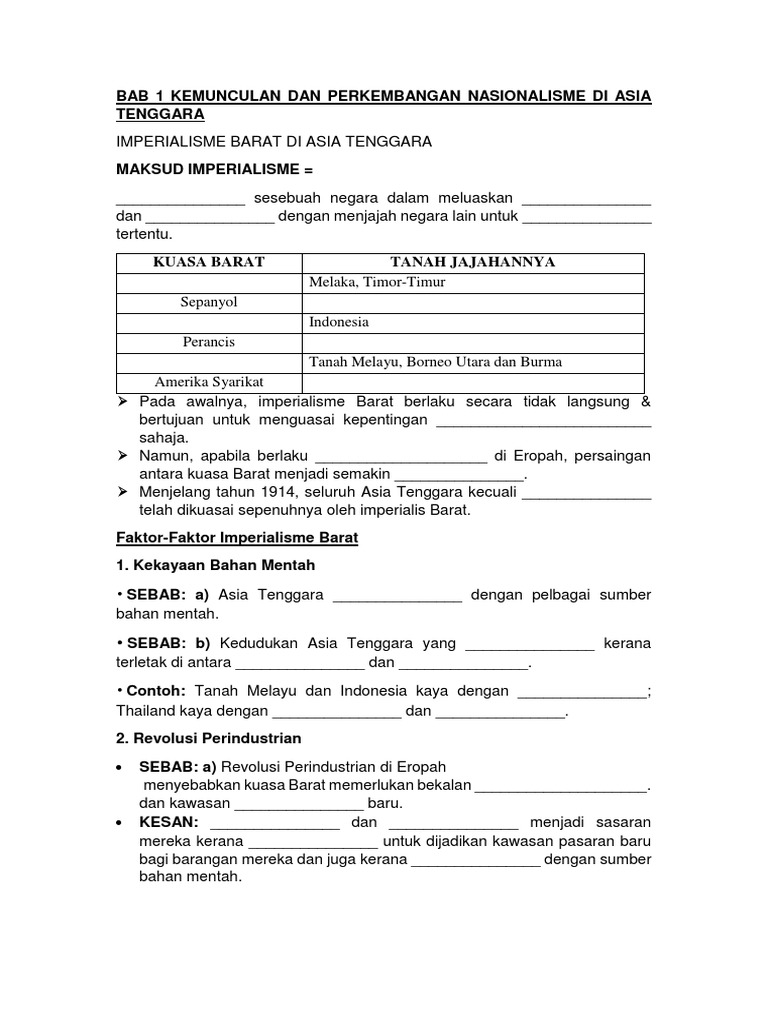 Nota Sejarah Tingkatan 5 Bab 1 Kemunculan Dan Perkembangan Nasionalisme Di Asia Tenggara from demo.dokumen.tips Asia tenggara kaya dengan bahan mentah serta mempunyai tanah yang subur sesuai dengan pelbagai tanaman. Imperialisme barat di asia tenggara dasar sesebuah negara meluaskan pengaruh dan wilayahnya dengan menjajah negara lain untuk kepentingan tertentu. Video dalam bab ini merangkumi penjelasan mengenai kemunculan dan perkembangan nasionalisme di asia tenggara. Kemunculan dan perkembangan nasionalisme di asia tenggara. Bab ulangkaji bagi subjek kemunculan dan perkembangan nasionalime di asia tenggara berdasarkan latihan pengukuhan yang telah disediakan. Kemunculan dan perkembangan nasionalisme di asia tenggara. Pemimpinnya golongan berpendidikan serta berpengetahuan luas dalam bidang kebudayaan_dan ilmu pengetahuan barat. Perjuangan setiap tahap berbeza dari corak,fahaman dan matlamatnya.