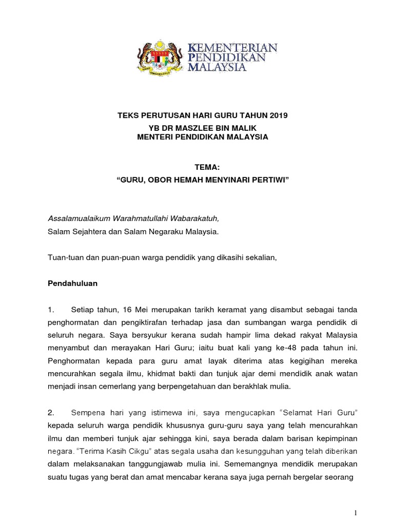 Perutusan Hari Guru 2019 - Sila klik video untuk berita selanjutnya.. Upacara bendera peringatan hari guru nasional 2019, dilaksanakan di halaman kantor kemendikbud, jakarta. Diadakannya upacara peringatan hari guru nasional bertujuan untuk beberapa hal berikut. Dengan penuh kebaikan, kau menjawab segala pertanyaan konyolku. Highlight sambutan bulan kebangsaan sksi 2 kuala kangsar 2019. Sehubungan itu, bagi menggambarkan pengiktirafan kepada jasa guru.